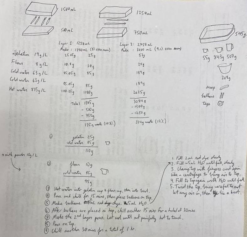 The following ingredients and ratios were determined from trial and error through multiple cycles of gelatin phantoms. Gelatin dissolves easily in hot (but not boiling) water. Milk powder can be used to make the gelatin phantoms opaque. Flour can be added to alter the consistency of the phantoms, but it alone will not render the phantoms opaque.