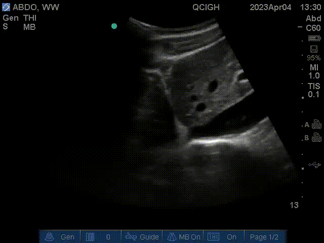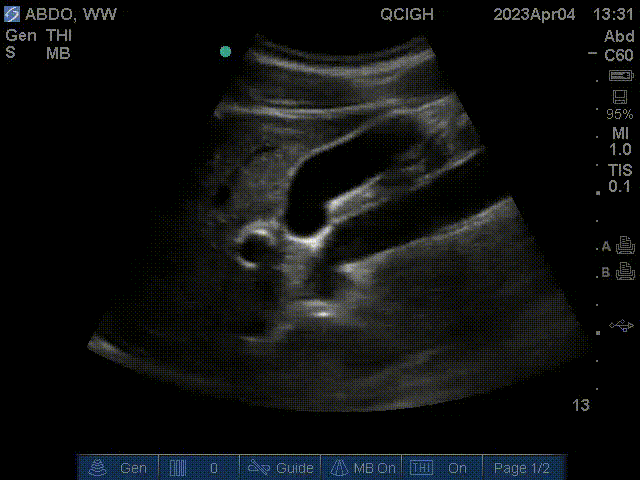 The gallbladder is visualized in this scan at the center of the image. In addition, the portal vein is the circular struction with a hyperechoic wall left of the gallbladder in this scan. The inferior vena cava is the cylindrical structure right of the liver.