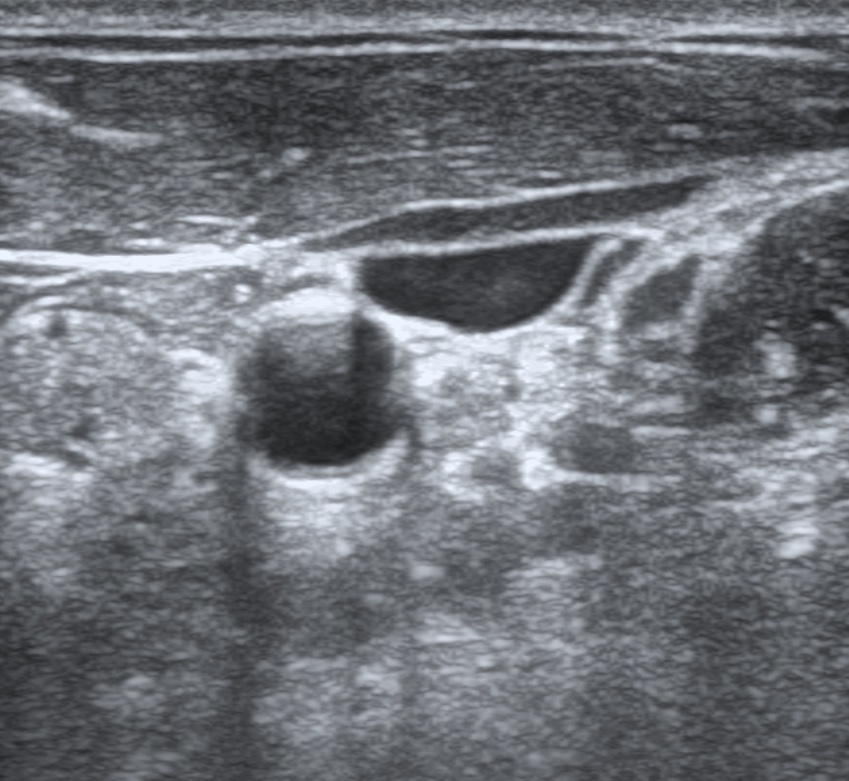 This scan shows the right lobe of the thyroid. The thyroid isthmus and a hyperechoic cartilaginous ring of the trachea is seen medial and anterior to the right thyroid lobe. The common carotid artery is seen pulsating medial to the right thyroid lobe.This is a scan of the left carotid sheath. The sternocleidomastoid is overlying the internal jugular vein, which is collapsable. The common carotid artery is round and does not collapse with compression. The vagus nerve is medial to the carotid and posterior to the IJ.